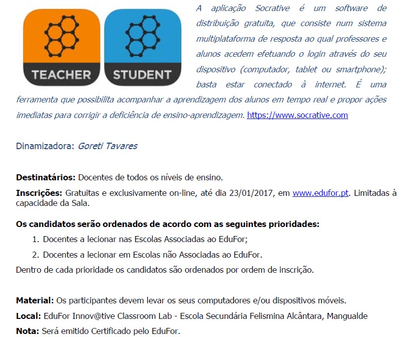 Data de afixação da lista de selecionados: a partir de 24/01/2016, em www.edufor.pt